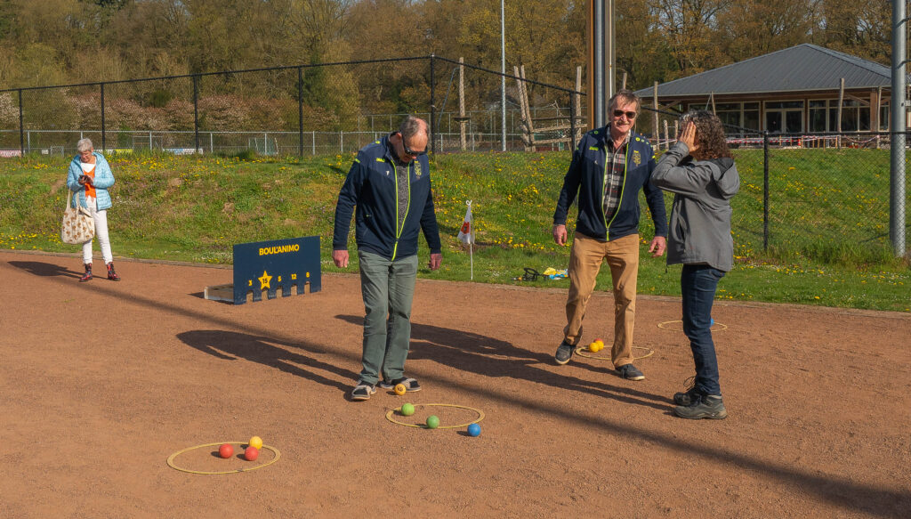 Zo ook voor Boul’Animo. Vorig jaar was het nog behoorlijk fris maar dit keer een strakblauwe lucht en een heerlijk zonnetje. Mart van Tol en Kees Tabink waren de begeleiders en waren hier wel een aantal uur mee zoet. Zij hadden wat cirkels en plastic boules (vanwege de veiligheid) en natuurlijk de marmotten/sjoelbak meegenomen.