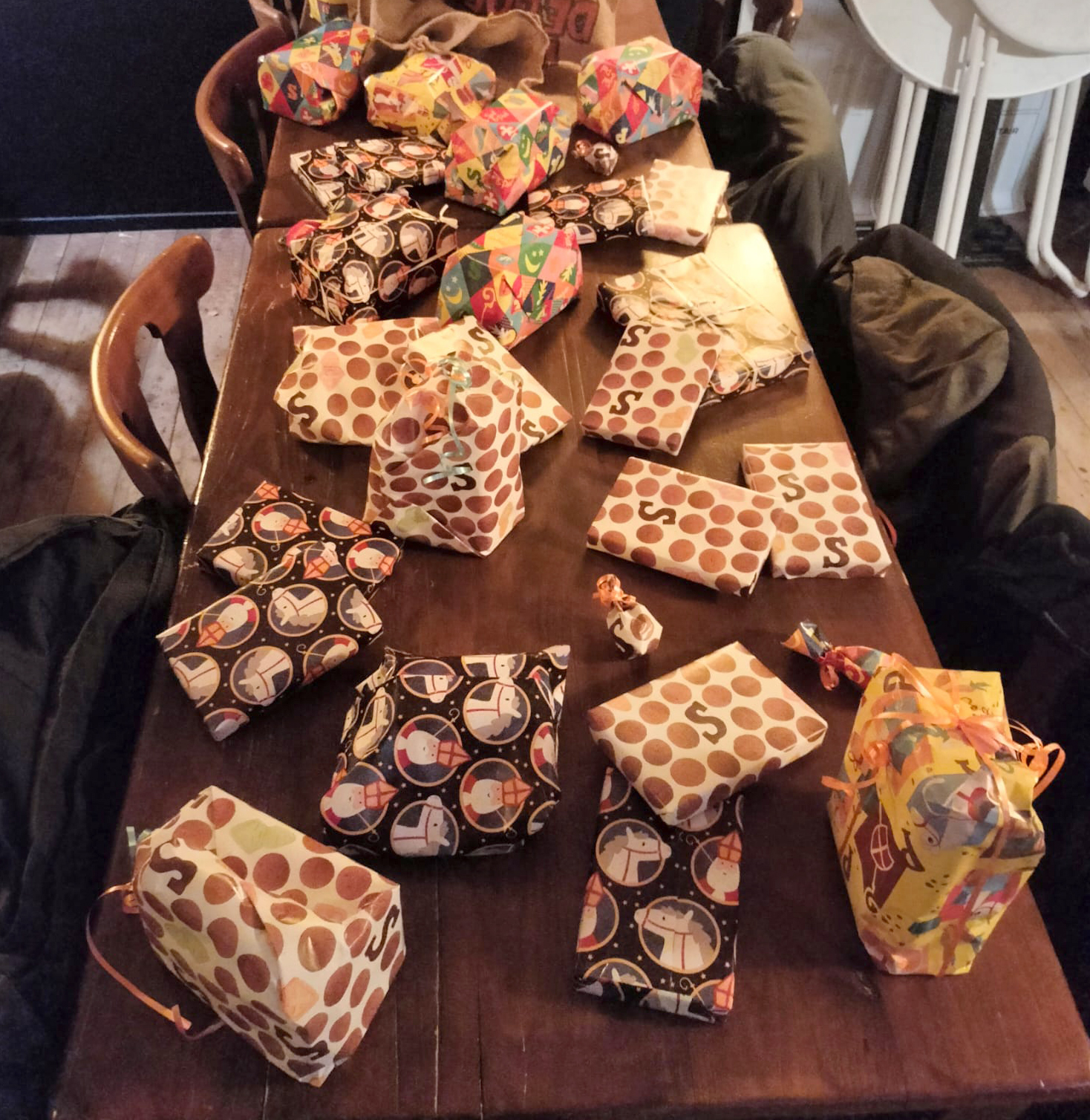 Na veel voorpret met inpakpiet zijn er 30 cadeautjes ingepakt. Wat een verrassing voor de Sint en Piet met deze zeer grote opkomst. Wel 34 deelnemers.